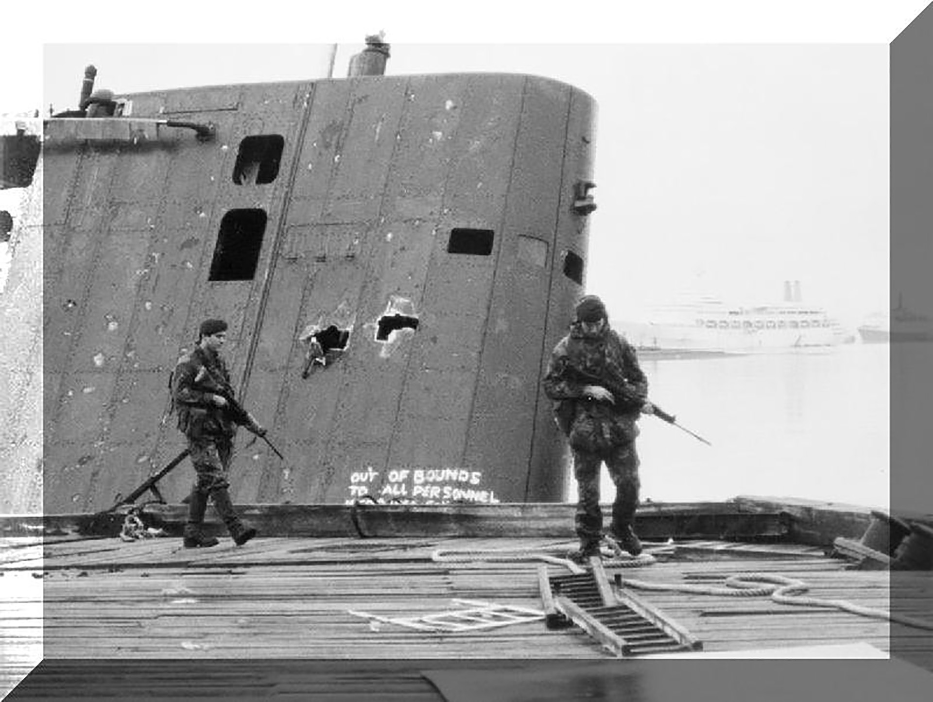 Los soldados ingleses y los tripulantes del submarino Santa Fe bombardeado durante la guerra en 1982