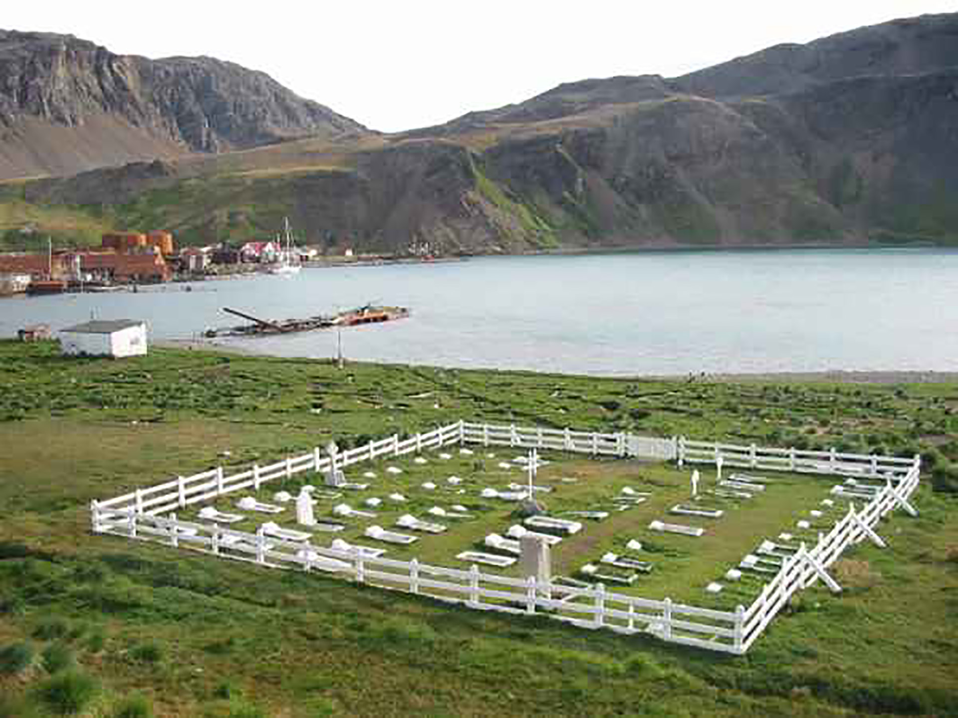 Cementerio de Grytviken, donde descansan los restos del único héroe argentino enterrado en Georgias del Sur.